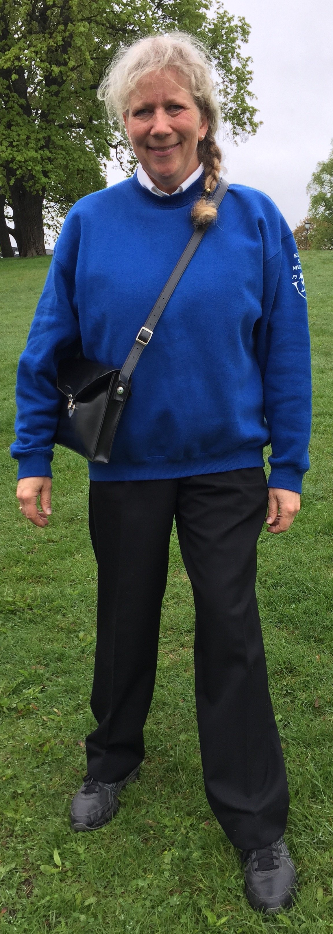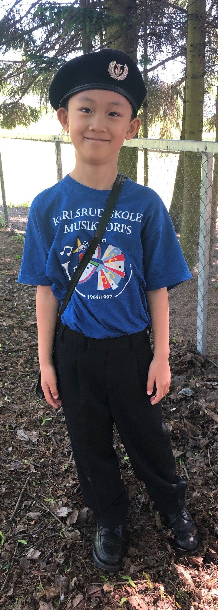 Alle tre korpsT-skjorte med korpsets logo, blå olabukse uten hull og noteveske (med regnfrakk). Ingen krav til sokker og sko