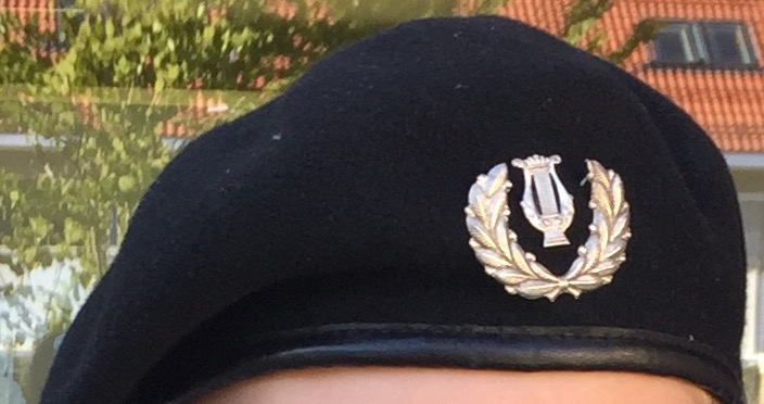 Beret med krans og lyre. Det følger med et strikkbånd som kan